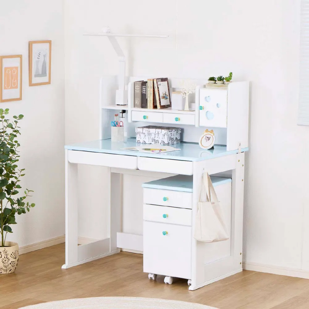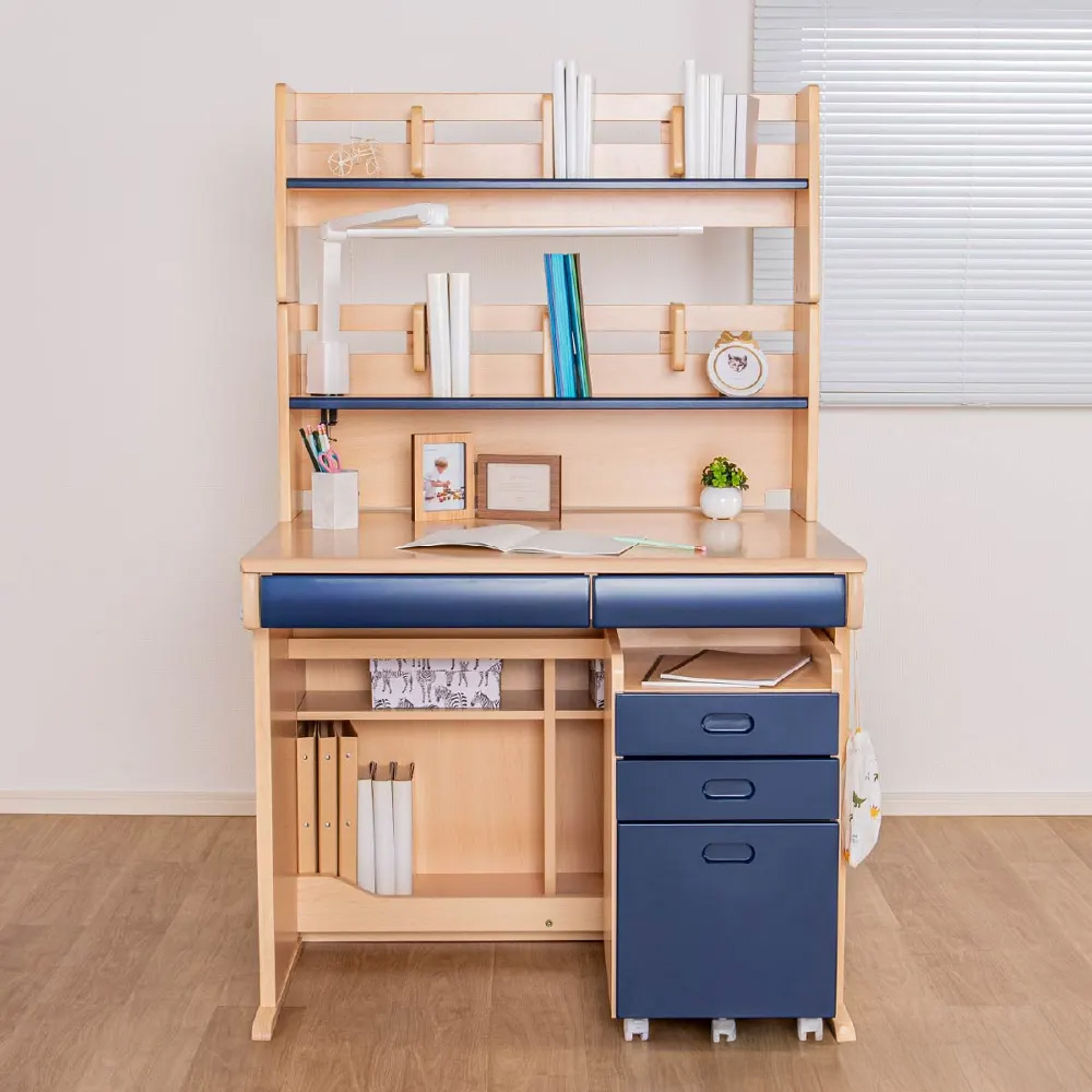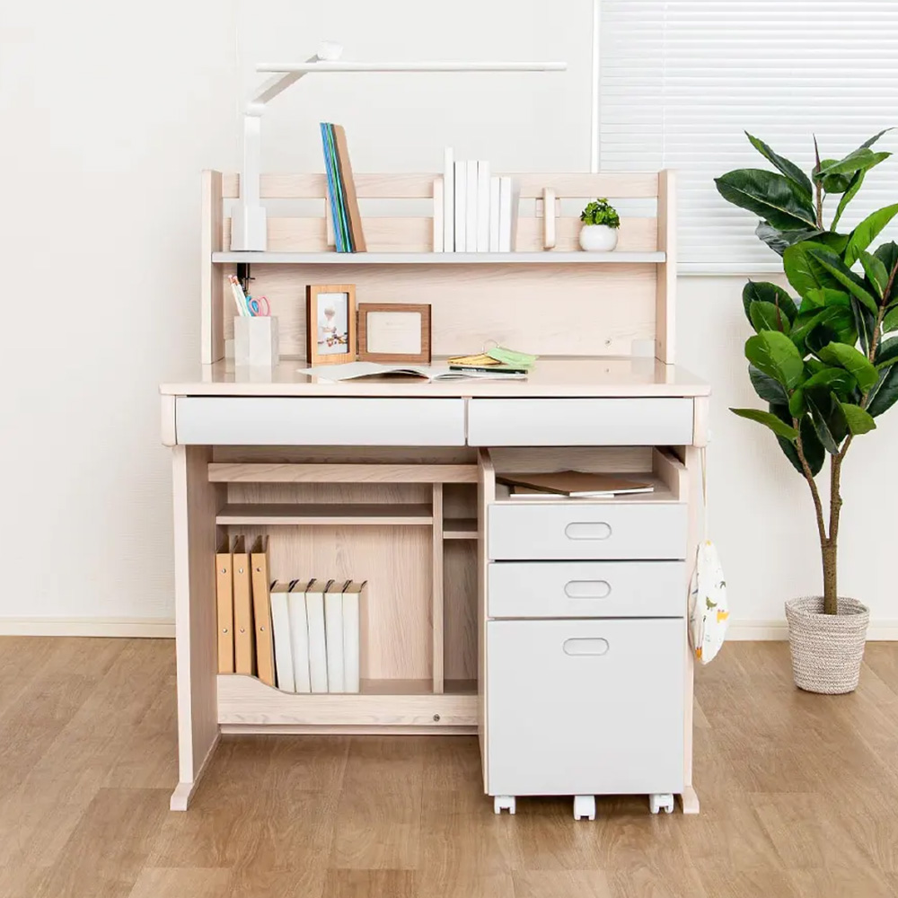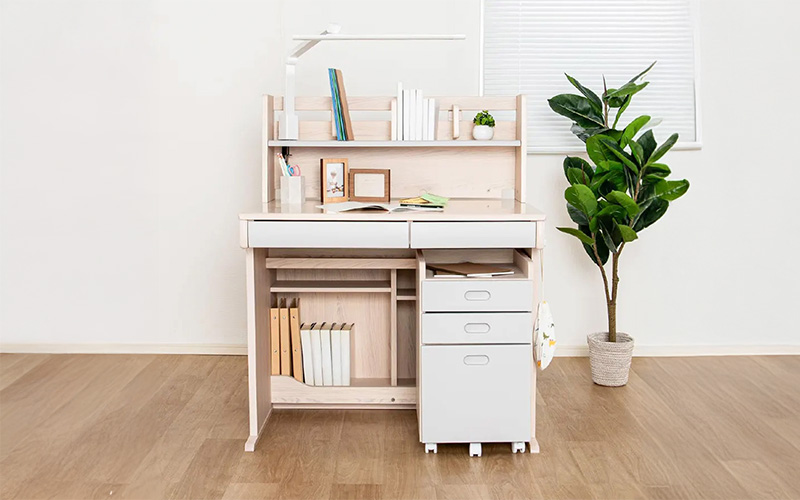 無垢の天然木を生かした、木の温かみとやさしさを感じるデザインに仕上がっています。デスク本体の引出しは広い奥行で大きなものをたっぷりと収納出来ます。