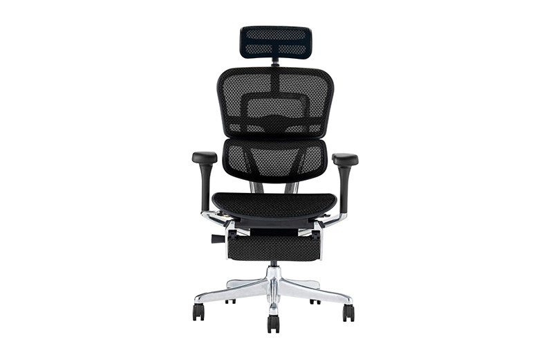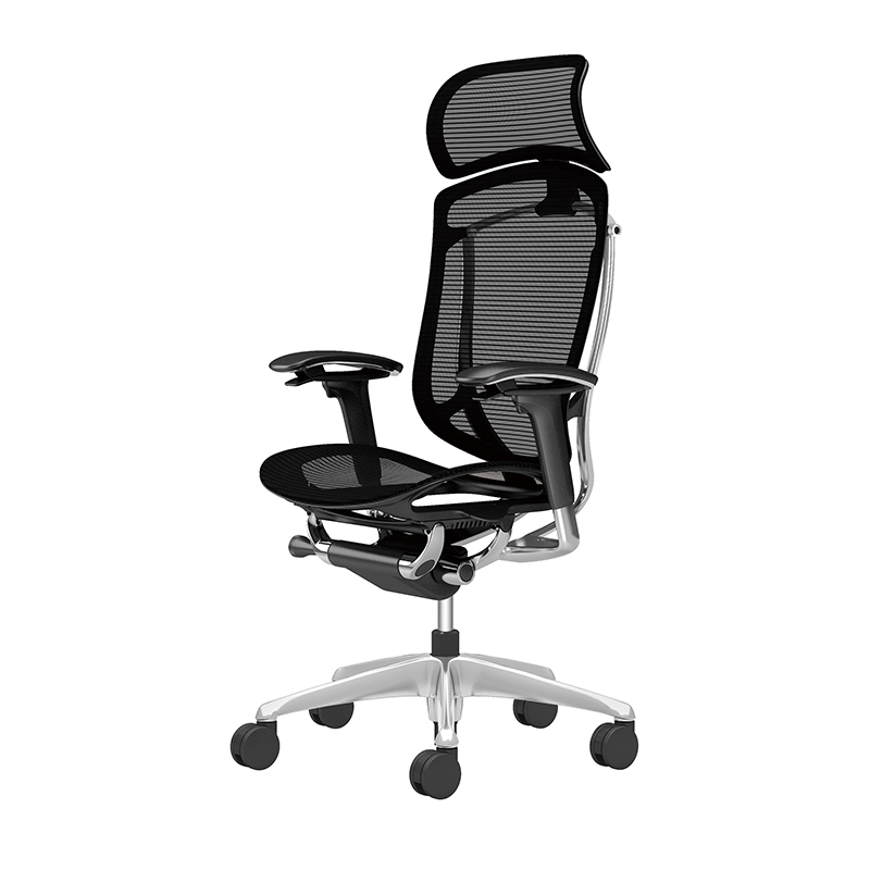 操作性を追求して開発された「ハイブリッドレバー」搭載。1つのレバーに3つの機能操作を集約。4方向に操作が可能な4Dアームレストを標準装備。アームパッドも広く、柔らかい素材を採用。弾力性に優れたメッシュを採用。多様な座り方に対応し、長時間のデスクワークをサポート。60mmサイズの双輪PUキャスターを標準搭載。高級感と耐久性のあるアルミポリッシュフレームを標準採用。収納式オットマンを搭載。よりリラックスした姿勢での休憩が可能。