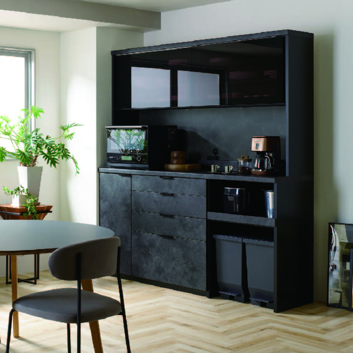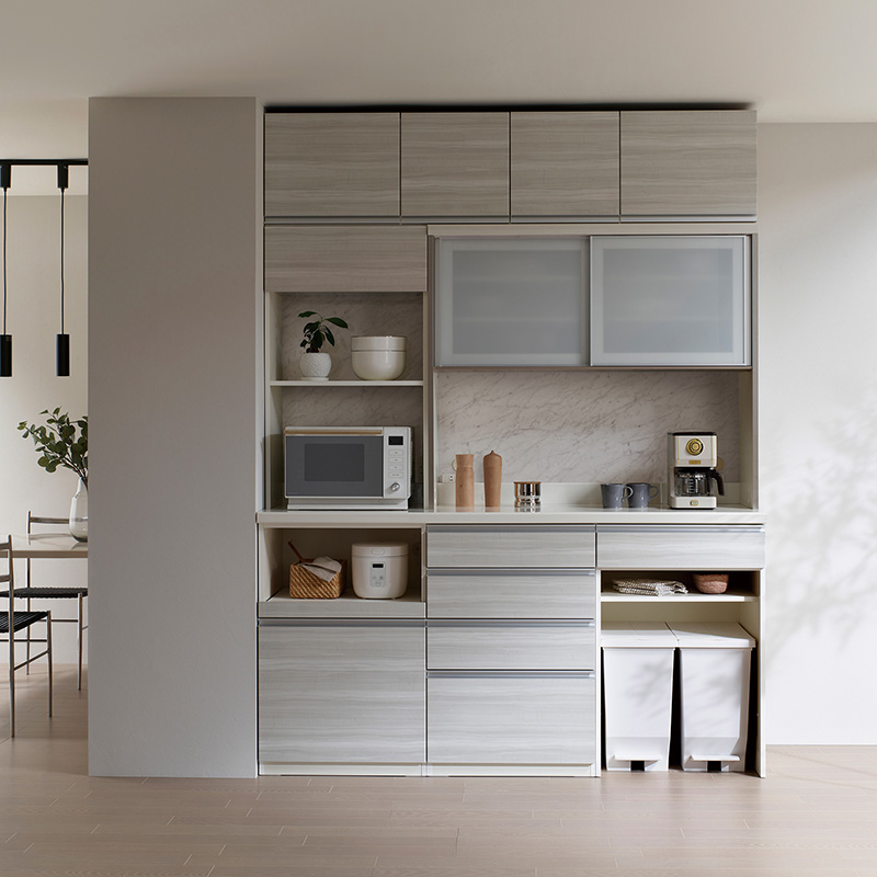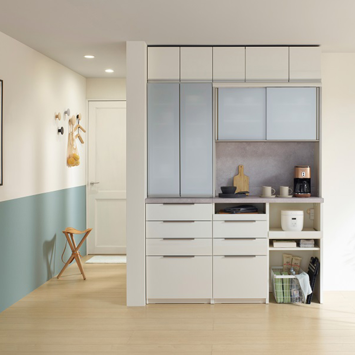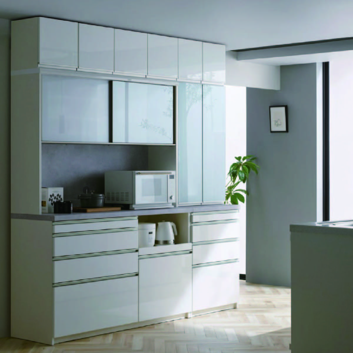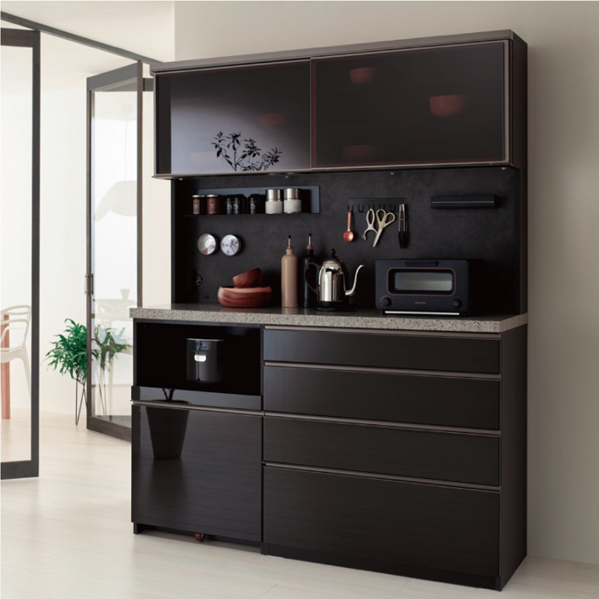 必要な機能がまとまった、デザイン性に優れたハイカウンター食器棚