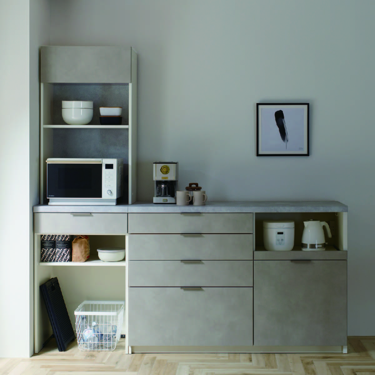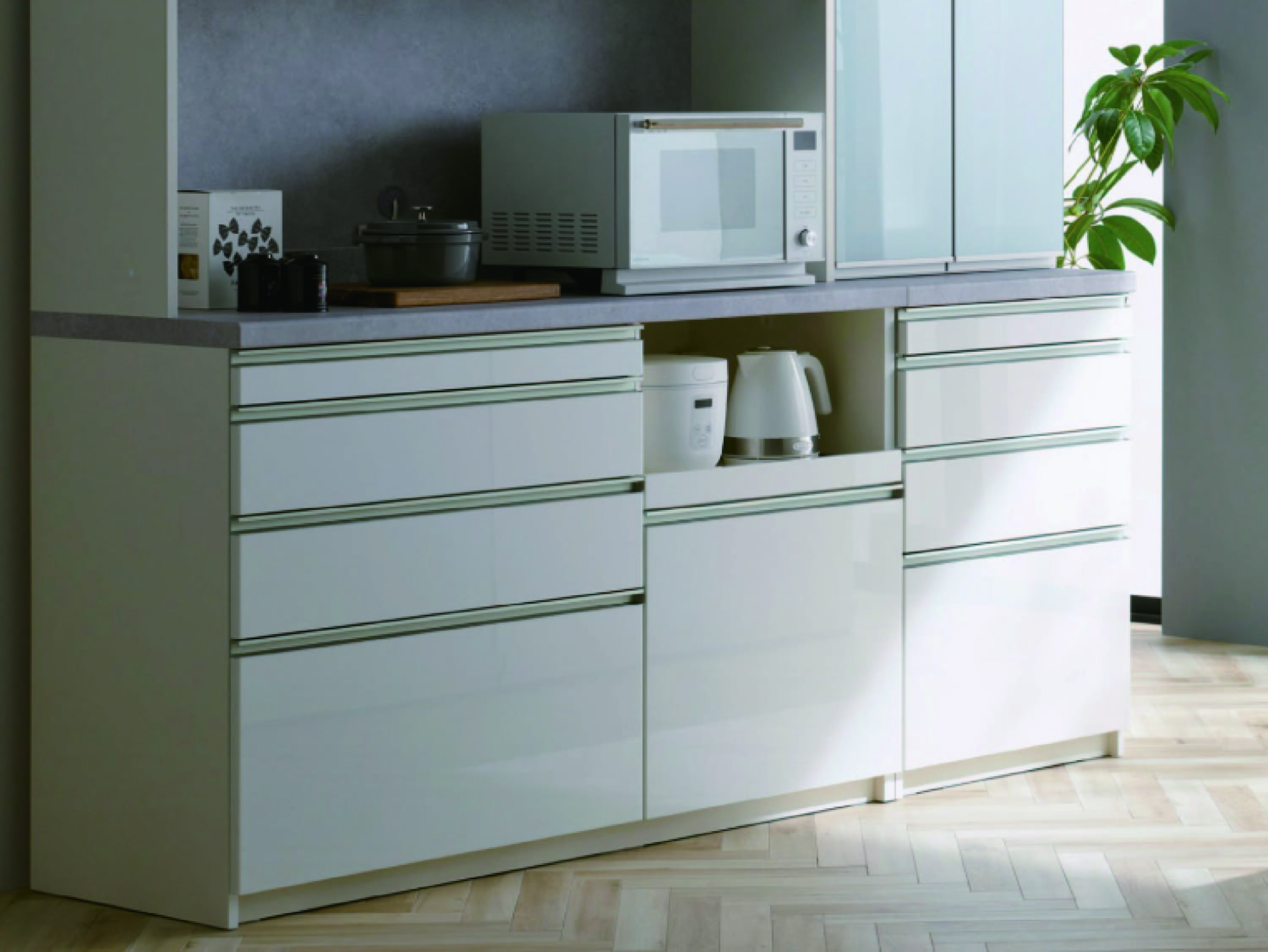 必要な機能がまとまった、デザイン性に優れたハイカウンター食器棚
