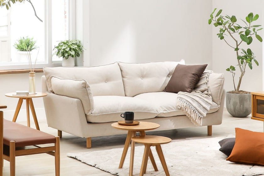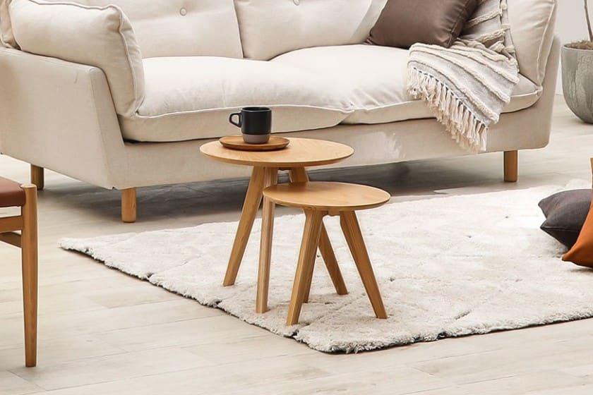 ソファの近くに置くリビングテーブルは、小さめのすっきりしたデザインがぴったり。一般的なリビングテーブルを置くより、横に少し変わったデザインのサイドテーブルだけ置くことで大人びた雰囲気になり、ソファの存在感が際立ち空間が生かされて、開放的な空間を演出できます。