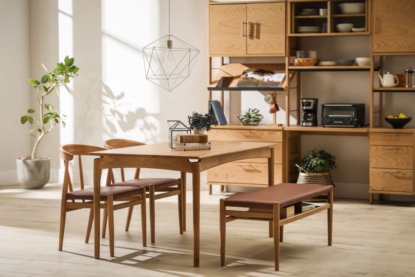 ダイニングチェアとして活用するベンチは棚がついたタイプにして、隠せる収納スペースを設けましょう。テーブルの上に置きがちなティッシュケースやリモコンなどを置けるので生活感が出ず、こだわりのデザインを邪魔しません。