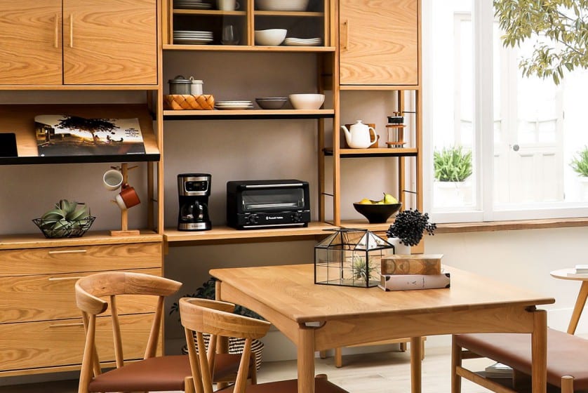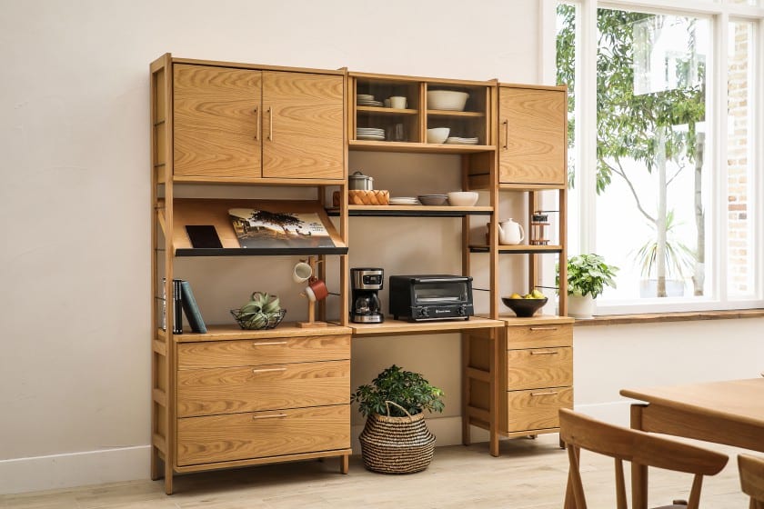 キャビネットやローボードなどの家具は、丸いフォルムの細めの脚で統一。テーブルやチェアと合わせて洗練された雰囲気が醸し出され、木材の味わいが感じられるすてきな空間になります。
