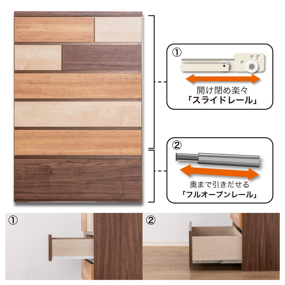◆上段には軽い力で引きだしやすいスライドレールを採用◆最下段は奥の物まで取り出しやすいフルスライドレールを採用