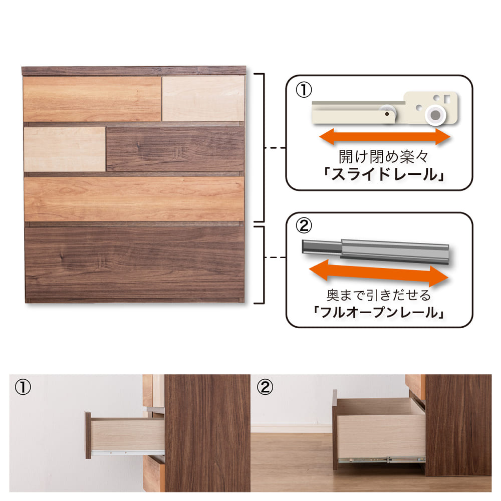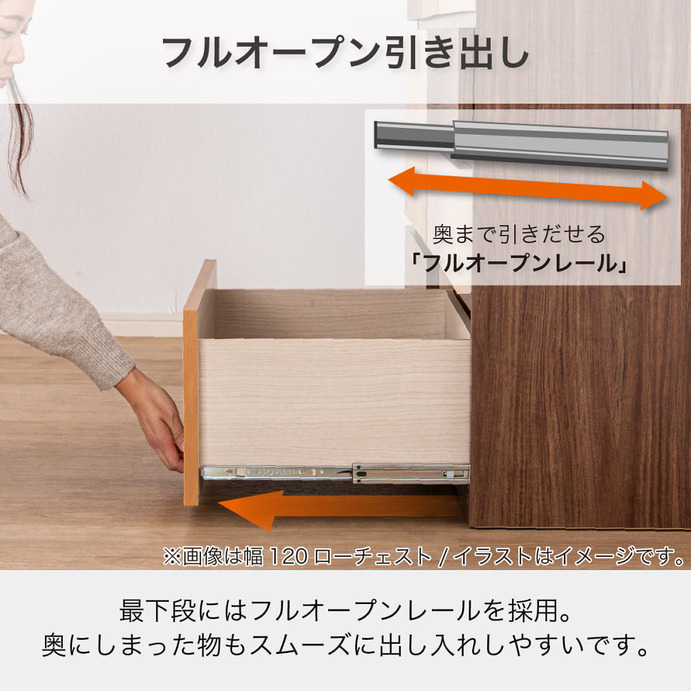 ◆上段には軽い力で引きだしやすいスライドレールを採用◆最下段は奥の物まで取り出しやすいフルスライドレールを採用