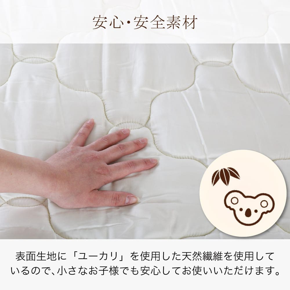 ◆特殊中空ポリエステル綿『フィルケアポリティ』を使用し、従来品に比べ通気性やクッション性を高めました。フィルケアは三つの穴が開いた中空構造。へたりにくく嵩高回復性に優れている。また、繊維を螺旋状にした『スパイラル構造』により、スプリングに似た弾性があり、羽毛タッチで優れた断熱性・発散性を備え、《抗菌・防臭加工》を施している。