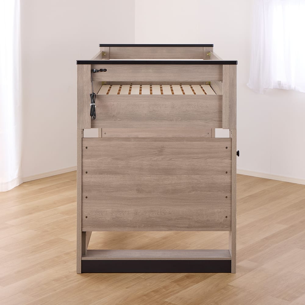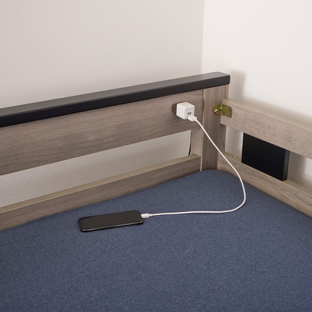 ・1口コンセント付、ベッドを下ろしてシングルベッドとして使用できます。