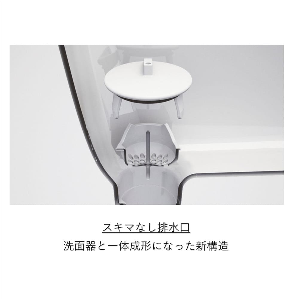 ◆スキマなし排水口:排水口は、洗面器と一体形成になった新構造。汚れがたまりにくい。